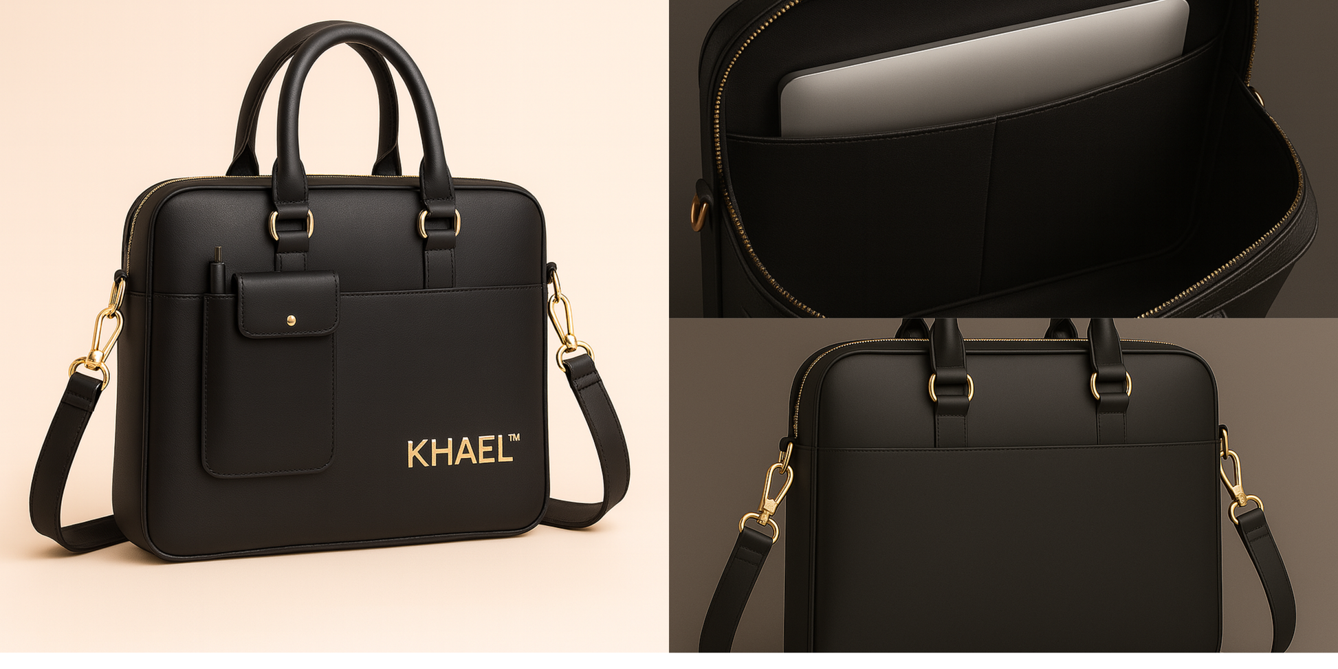 The KHAEL™ Midnight laptop bag is designed for teens and Khaelies who want style and practicality in one. This sleek black bag features two spacious compartments one for your laptop and one for your textbook , giving you room for everything you need for school or daily use. A signature front pocket adds space for your phone, pen, and small essentials. Crafted in a compact, easy to carry size, the bag fits comfortably in your hand or over your shoulder, while still offering enough space for everyday items without feeling bulky. Finished in the bold, premium Midnight tone, this bag is the perfect everyday luxury for every Khaelie